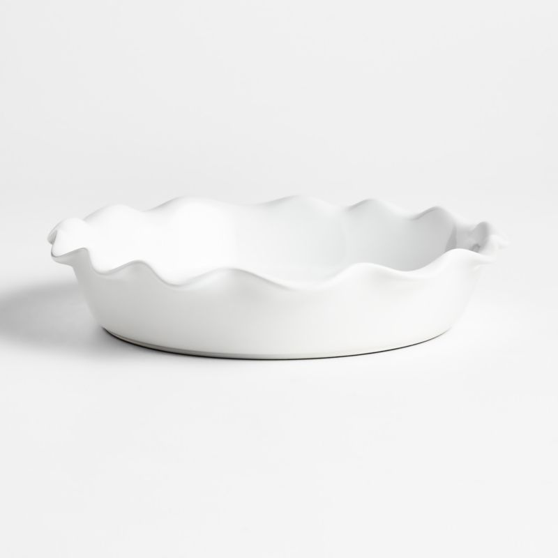 Sweets and savories go from oven to table in fresh white stoneware with flowing scalloped edges. Our ruffled pie dish bakes and presents sweet potato shepherd's pie, broccoli au gratin and boysenberry pie with charming, classic style. Finished in a bright white glaze, our exclusive pie pan is microwave-, freezer-, oven- and dishwasher-safe for flexible preparation and easy cleanup.