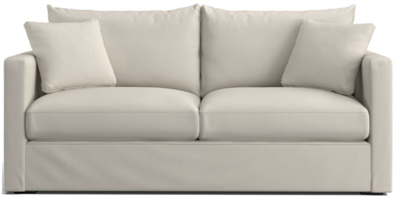 Willow's more modern lines relax in cottage style, instantly putting family rooms, casual living rooms and guest bedrooms in a vacation state of mind. A welcoming retreat, the sofa beckons with plush cushions and the laid-back cool of washed cotton slipcovers. Featuring a deep bench seat and pillowy back cushions, the sleeper sofa conceals a comfy, queen-size mattress that pulls out easily when night falls. The fitted slipcovers keep the look casual yet neat, tailored in easy-to-clean, stain-resistant cotton. Our Willow slipcovered queen sleeper sofa is a Crate & Barrel exclusive.
