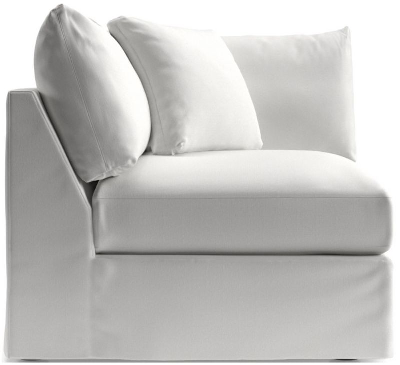 Our Willow sectional's more modern lines relax in cottage style, instantly putting family and casual living rooms in a vacation state of mind. A welcoming retreat, the corner chair unites Willow sectional components with a deep seat, pillowy back cushions and the laid-back cool of washed cotton slipcovers. Tailored with a fitted look, the slipcovers keep the look casual yet neat, made of easy-to-clean, stain-resistant cotton. The Willow slipcovered sectional corner chair is a Crate & Barrel exclusive.