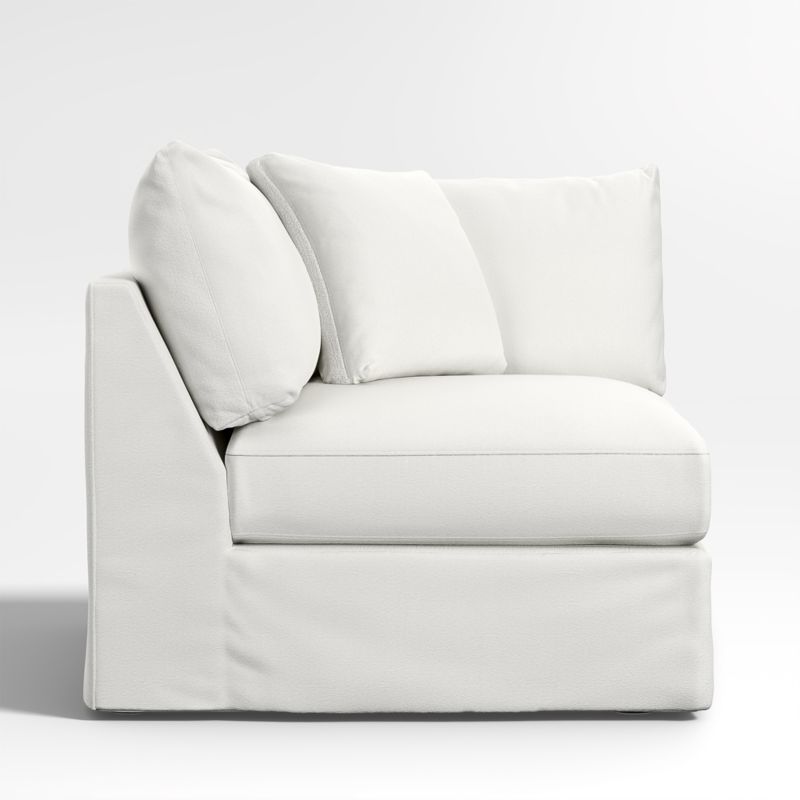 Our Willow sectional's more modern lines relax in cottage style, instantly putting family and casual living rooms in a vacation state of mind. A welcoming retreat, the corner chair unites Willow sectional components with a deep seat, pillowy back cushions and the laid-back cool of washed cotton slipcovers. Tailored with a fitted look, the slipcovers keep the look casual yet neat, made of easy-to-clean, stain-resistant cotton. The Willow slipcovered sectional corner chair is a Crate & Barrel exclusive.