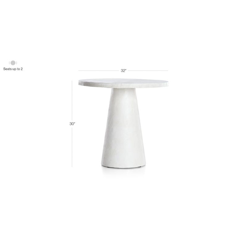 Our Willy bistro table distills the classic pedestal table down to its striking essentials. The table's bold conical pedestal and simple round top are made from concrete material that creates a plaster-like appearance but is lighter in weight and more easily fabricated into these dramatically simple shapes. Bistro-scaled to seat two, the table is lightly textured to resemble the earthy feel and rustic look of actual plaster. The Willy White Plaster Pedestal Dining Table is a Crate & Barrel exclusive.