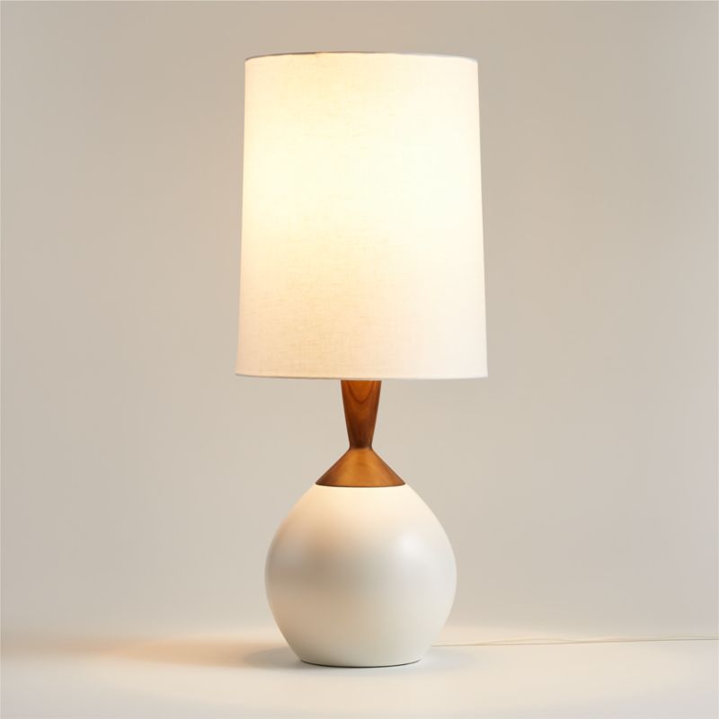 Inspired by mid-century modern design, our Wilson table lamp captures the style's impeccable pairing of clean lines and organic materials. A sharply angled hourglass of solid walnut tops the ceramic base, flowing seamlessly into the round silhouette. We love the way the wood contrasts warmly with the crisp white base and linen shade. Pair our Wilson lamp with the coordinating chandelier to infuse a modern home with a touch of mid-century beauty.