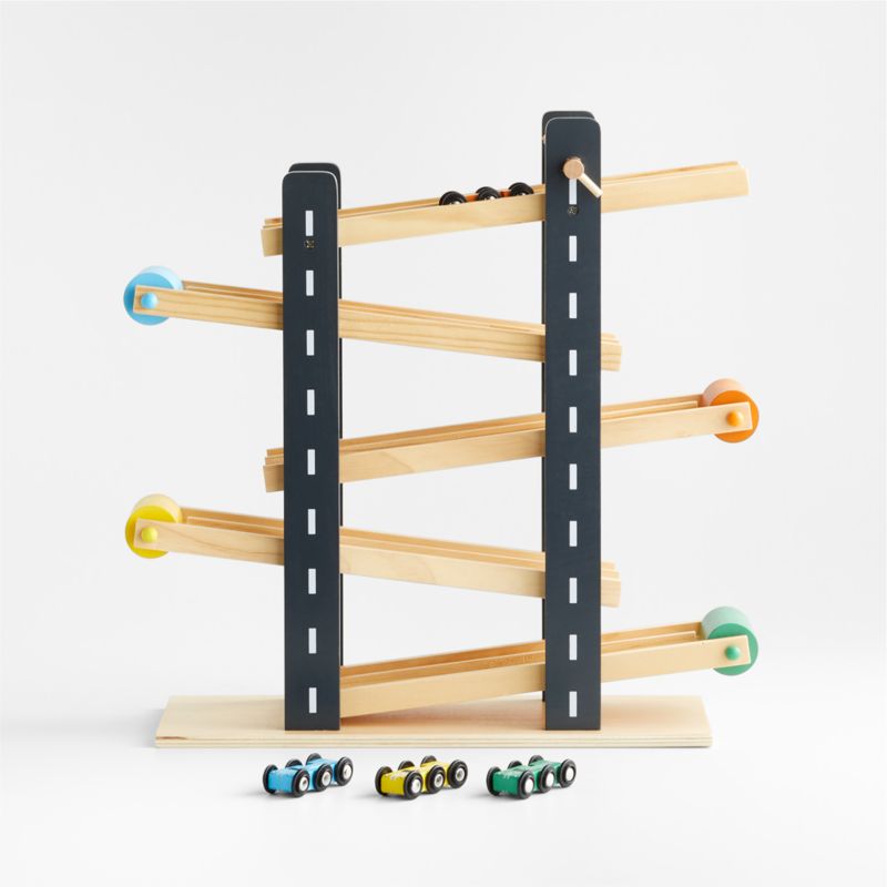 From the top of the track to the finish line, this compact car track provides hours of racing fun. Brightly painted cars zoom down the slopes, adorned with stylish racing stripes. The set includes four cars so children can play solo or set up a race with friends—developing their fine motor skills along the way. What's more: this classic baby toy makes for a wonderful gift.