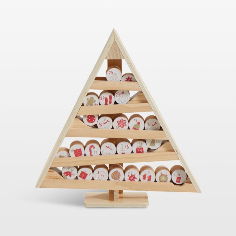 Our modern Tree of Glee Advent Calendar from Wonder & Wise by Asweets will make spirits bright all season long, year after year. The wooden tree-shaped frame holds 25 small wooden canisters that can be filled with coins, candy, handwritten notes or anything else you can dream up. Each time a child pulls a canister, the others roll merrily down the tree, counting down the days until Christmas.