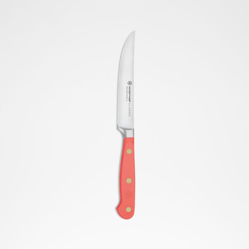 The perfect partner to expressive cuisine, this coral-handled steak knife jazzes up your kitchen with a pop of vibrant color. Part of Wusthof's Classic series known for its durability and high quality, the steak knife is an essential component of tableside cutlery. The knife cuts any type of meat without tearing the fibers thanks to an extra-sharp blade that's precision forged from a single piece of high-carbon stainless steel with a long-lasting edge. The brass-riveted handle provides the full-tang knife with a comfortable handhold as well as a dash of peach-inspired color.