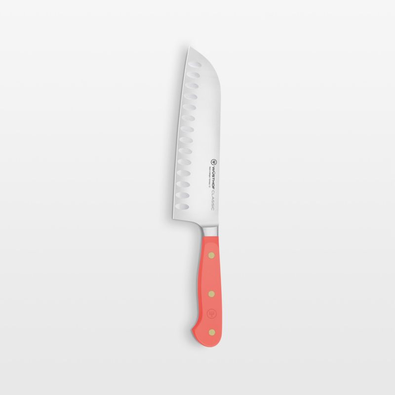 The perfect partner to expressive cuisine, this coral-handled santoku knife jazzes up your kitchen with a pop of vibrant color. Part of Wusthof's Classic series known for its durability and high quality, the large knife is an essential component of any cutlery collection. The versatile knife excels at mincing, chopping and wafer-thin slicing thanks to a razor-sharp blade that's forged from a single piece of high-carbon stainless steel and finished with a long-lasting edge. A brass-riveted handle provides the full-tang knife with a comfortable handhold as well as a dash of peach-inspired color.