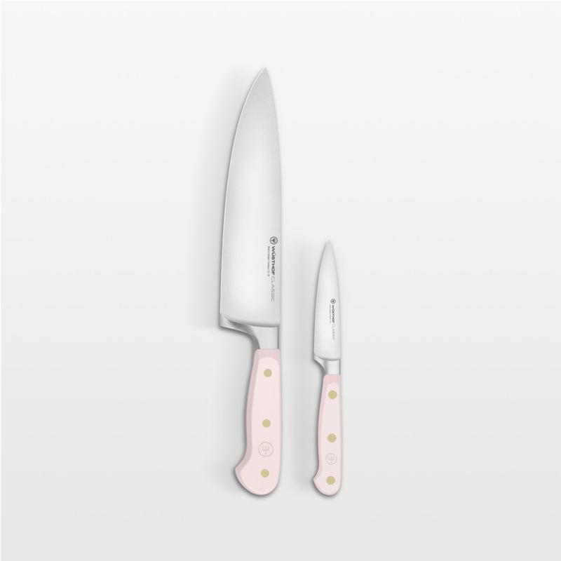 The perfect partner to expressive cuisine, this set of pink-handled knives complements your kitchen with a rosy hue. Part of Wusthof's Classic series known for its durability and high quality, the set of 8-inch chef and 3.5-inch paring knives form the basis of any cutlery collection. Each knife is forged from a single piece of high-carbon stainless steel and finished with a long-lasting edge. Brass-riveted handles provide the full-tang knives with a comfortable handhold as well as a dash of pink in a shade inspired by Himalayan salt.