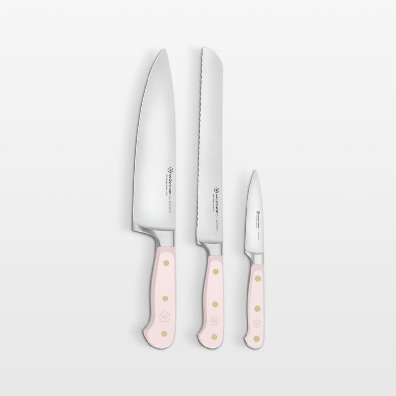 The perfect partner to expressive cuisine, this set of pink-handled knives complements your kitchen with a rosy hue. Part of Wusthof's Classic series known for its durability and high quality, the set of 8-inch chef, 8-inch bread and 3.5-inch paring knives form the basis of any cutlery collection. Each knife is forged from a single piece of high-carbon stainless steel and finished with a long-lasting edge. Brass-riveted handles provide the full-tang knives with a comfortable handhold as well as a dash of pink in a shade inspired by Himalayan salt.