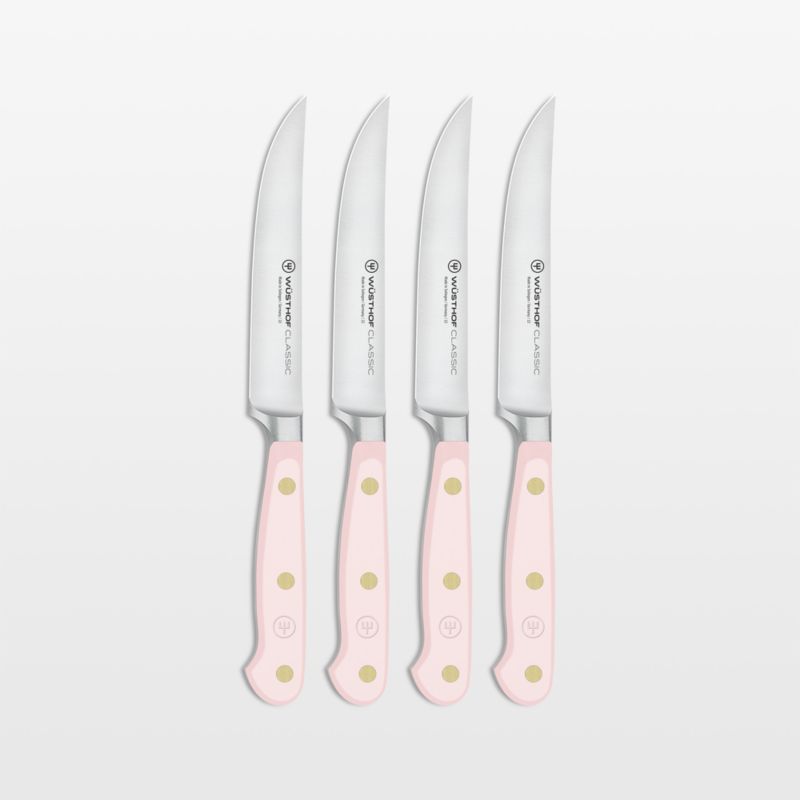 The perfect partner to expressive cuisine, these pink-handled steak knives jazz up your dining table with a pop of vibrant color. Part of Wusthof's Classic series known for its durability and high quality, the steak knives are an essential component of tableside cutlery. The knives cut any type of meat without tearing the fibers thanks to extra-sharp blades that are precision forged from high-carbon stainless steel and finished with long-lasting edges. brass-riveted handles provide the full-tang knives in this set of four with a comfortable handhold as well as a dash of color inspired by pink Himalayan salt.