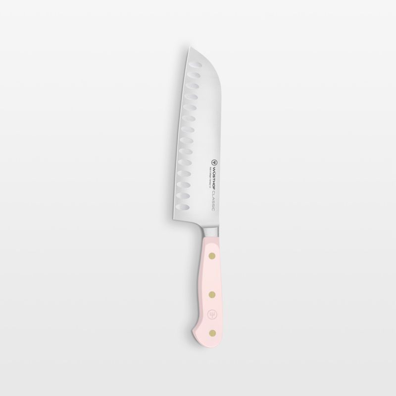 The perfect partner to expressive cuisine, this pink-handled santoku knife jazzes up your kitchen with a pop of vibrant color. Part of Wusthof's Classic series known for its durability and high quality, the large knife is an essential component of any cutlery collection. The versatile knife excels at mincing, chopping and wafer-thin slicing thanks to a razor-sharp blade that's forged from a single piece of high-carbon stainless steel and finished with a long-lasting edge. A brass-riveted handle provides the full-tang knife with a comfortable handhold as well as a dash of color inspired by pink Himalayan salt.