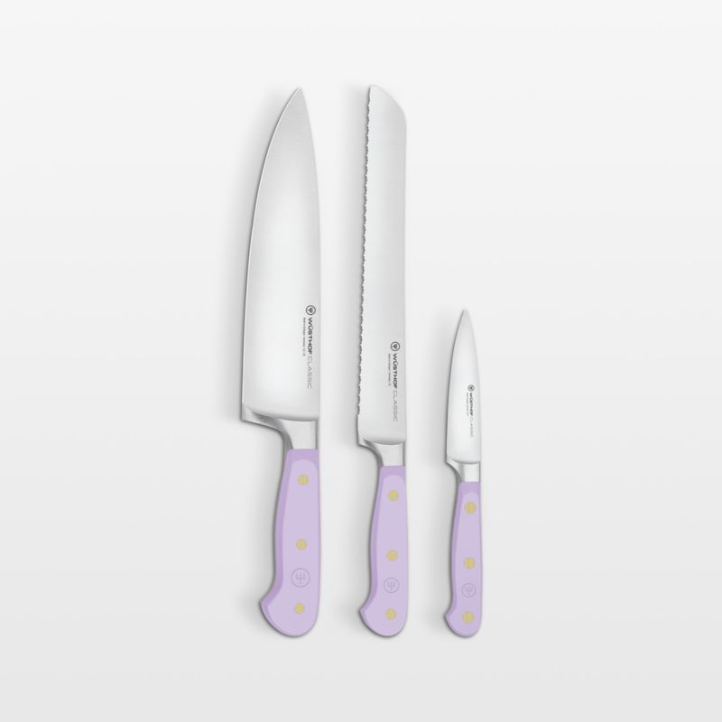 The perfect partner to expressive cuisine, this set of purple-handled knives complements your kitchen with vibrant color. Part of Wusthof's Classic series known for its durability and high quality, the set of 8-inch chef, 8-inch bread and 3.5-inch paring knives form the basis of any cutlery collection. Each knife is forged from a single piece of high-carbon stainless steel and finished with a long-lasting edge. Brass-riveted handles provide the full-tang knives with a comfortable handhold as well as a dash of purple the shade of freshly cut Peruvian potatoes.