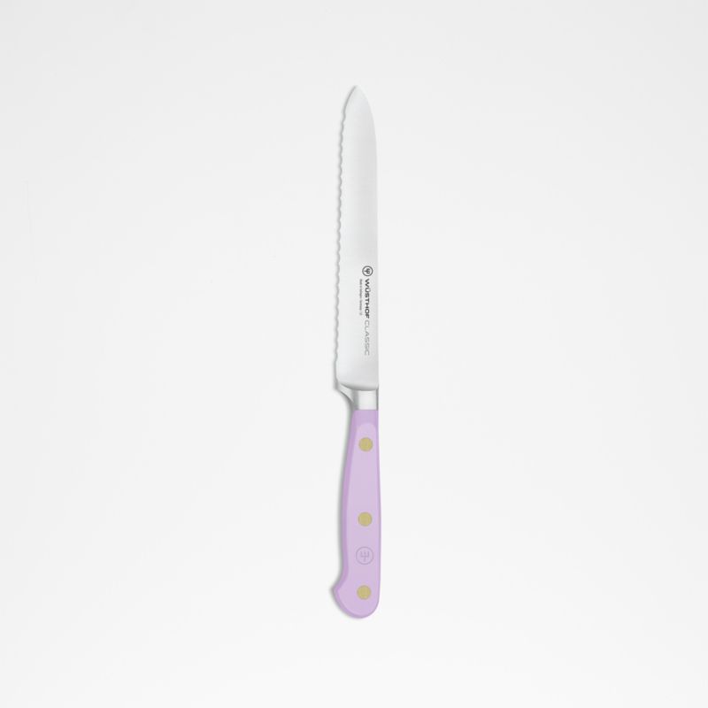 The perfect partner to expressive cuisine, this purple-handled utility knife jazzes up your kitchen with a pop of vibrant color. Part of Wusthof's Classic series known for its durability and high quality, the serrated utility knife is an essential component of any cutlery collection. The knife is an excellent choice for cutting cleanly through bread rolls, tomatoes, sandwiches and more without tearing thanks to a serrated blade that's precision forged from a single piece of high-carbon stainless steel and finished with a long-lasting edge. A brass-riveted handle provides the full-tang knife with a comfortable handhold as well as a dash of color the shade of freshly cut Peruvian potatoes.