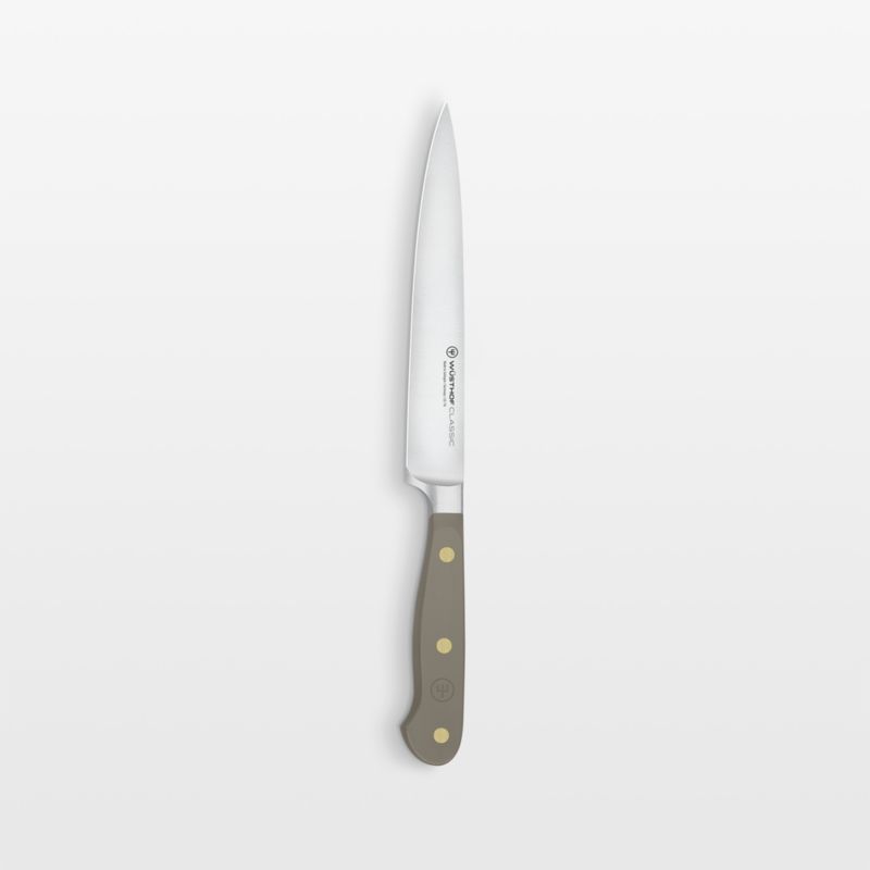 The perfect partner to expressive cuisine, this grey-handled utility knife jazzes up your kitchen with a chic neutral. Part of Wusthof's Classic series known for its durability and high quality, the utility knife is an essential component of any cutlery collection. The versatile knife comes in handy for a wide range of cutting tasks thanks to a blade that's precision forged from a single piece of high-carbon stainless steel and finished with a long-lasting edge. A brass-riveted handle provides the full-tang knife with a comfortable handhold as well as a dash of oyster-inspired grey.
