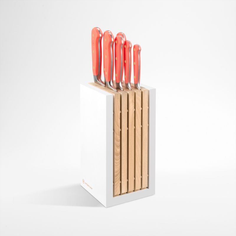 The perfect partner to expressive cuisine, these coral-handled knives jazz up your kitchen with inspired color. The set—part of Wüsthof's Classic series known for its durability and high quality—includes everything you need for a full-service cutlery collection. Equipped with brass-riveted handles in peach-inspired orange, the precision-forged knives feature hardened high-carbon steel blades with laser-controlled edges that are easy to sharpen. The eight-piece set includes a 3.5-inch paring knife, 5-inch serrated utility knife, 6-inch utility knife, 6- and 8-inch chef knives, 7-inch santoku knife and 9-inch serrated bread knife, all housed in a hardwood block.