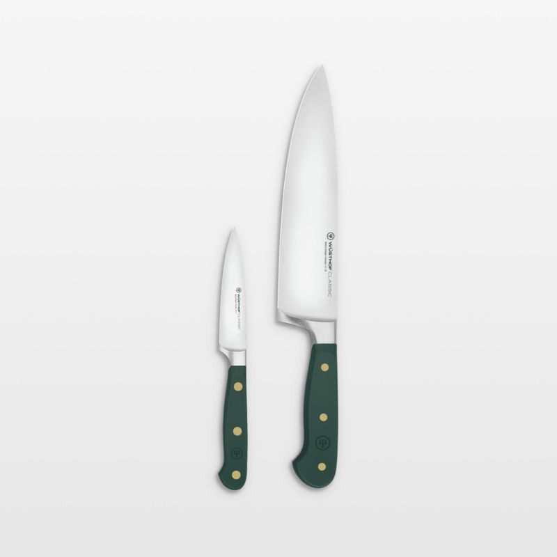 The perfect partner to expressive cuisine, this set of green-handled knives complements your kitchen with vibrant color. Part of Wusthof's Classic series known for its durability and high quality, the set of 8-inch chef and 3.5-inch paring knives form the basis of any cutlery collection. Each knife is forged from a single piece of high-carbon stainless steel and finished with a long-lasting edge. Brass-riveted handles provide the full-tang knives with comfortable handholds as well as a dash of green in a vibrant shade inspired by fresh rosemary.