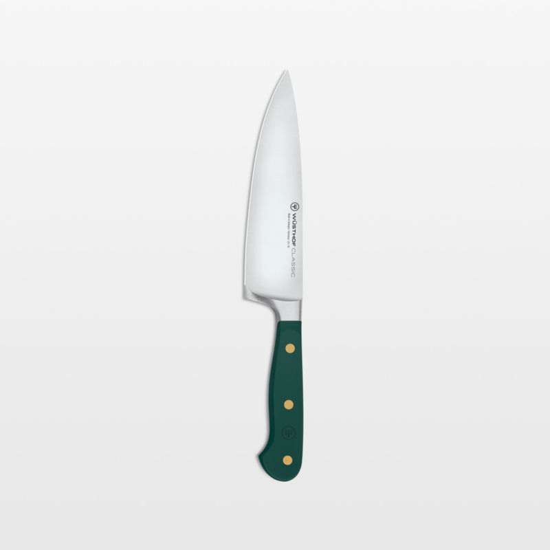 The perfect partner to expressive cuisine, this green-handled chef's knife brightens your kitchen with a pop of vibrant color. Part of Wusthof's Classic series known for its durability and high quality, the knife is an essential component of any cutlery collection. The knife excels at a wide variety of cutting thanks to a sharp blade that's precision forged from a single piece of high-carbon stainless steel and finished with a long-lasting edge. A brass-riveted handle provides the full-tang knife with a comfortable handhold as well as a dash of color inspired by fresh rosemary.