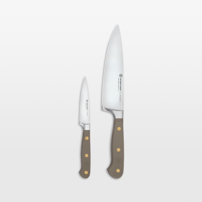 The perfect partner to expressive cuisine, this set of grey-handled knives from one of the most respected names in cutlery complements your kitchen with vibrant color. The paring and chef's knives feature strong, long-lasting blades of hand-forged, tempered and hardened high-carbon steel with long-lasting, V-ground edges that are easy to sharpen. In a process that involves 38 separate steps of hammering, shaping, refining, sharpening, buffing and polishing, a solid sheet of steel is transformed into working art that will hold its edge and maintain its shape. A cheerful presence in your knife block, the high-impact, triple-riveted handles provide a comfortable handhold as well as a dash of oyster-inspired grey.