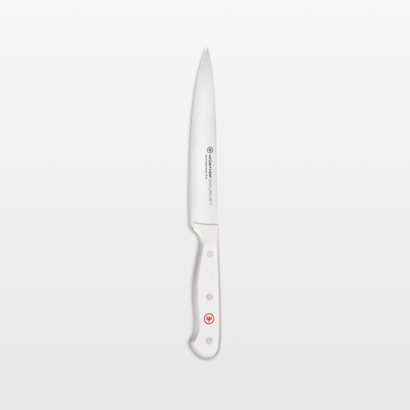 One of the most trusted names in cutlery, Wüsthof offers a versatile utility knife for a wide variety of cutting tasks. The high-carbon stainless blade boasts a full tang for stability, weight and impeccable balance. More durable and sanitary than wood, the bright white synthetic handle is comfortable in-hand. This utility knife excels at slicing onions, cutting herbs and chopping fruits, doubling as a larding knife to easily trim meat and skin poultry.
