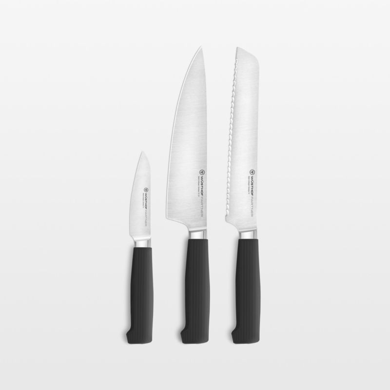 The Wüsthof Partner set pairs three kitchen essentials—paring, bread and chef's knives—made with high-quality, fully forged steel blades. Light, agile, sharp and recipe-ready, these classic knives have been redesigned with the needs of everyday cooks in mind. Full-tang and half-bolster construction offer stability and optimal balance, while durable blades made of premium German steel are precision forged for superior hardness and laser honed for lasting sharpness. Glass fiber-reinforced handles are specially designed to feel comfortable and stable in the hand.