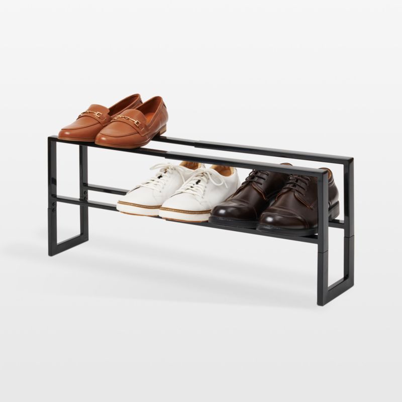 Yamazaki's expandable shoe rack maximizes storage with a small footprint and minimalist design. Made of black-finished steel, the rack has two tiers as well as room underneath the rack to store shoes—up to 12 pairs when fully expanded. Clean-lined and functional, the rack works in the closet as well as on view in a mudroom or entryway.