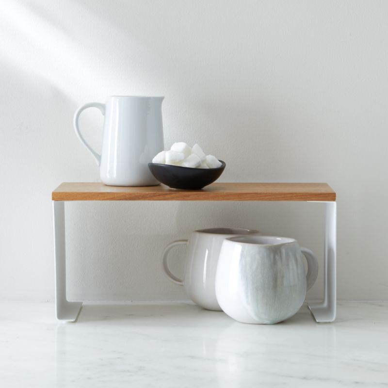 Elevate essentials while increasing storage with this Scandinavian-inspired rack. Whether used separately or stacked in multiples, the kitchen rack provides additional space in cabinets, on countertops or on open shelving. A warmly hued wooden shelf contrasts beautifully with the steel legs finished in glossy white. Use the small stackable kitchen rack to store cooking essentials, stack dishes or create a charming coffee station.