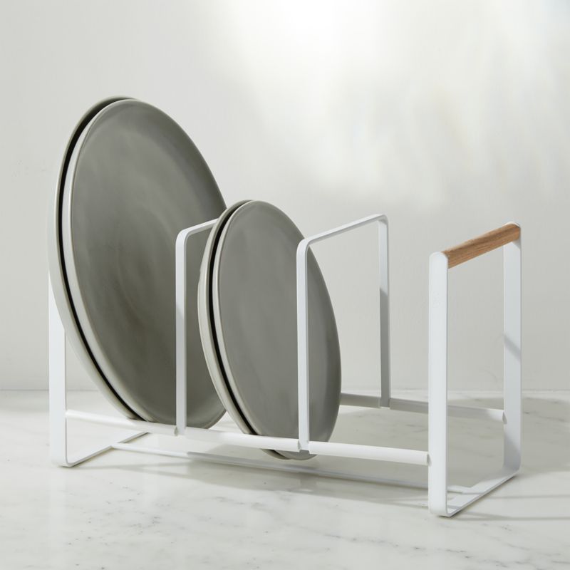 Accented with warmly contrasting wooden rods, this architectural rack in bright white protects your plates from damage while saving precious cabinet space. Three open compartments allow convenient access to plates of different sizes—such as salad, dinner and dessert—while the silicone-wrapped horizontal bars keep plates safe and upright. Coated in glossy white with a clean-lined design, the steel rack looks modern on open shelving, in your cupboards or drying dishes on the countertop.
