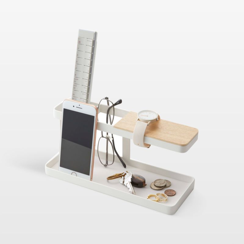 Lean, hang, rest and contain all your desk essentials on this multitasking organizer from Yamazaki. Made of white-finished steel, the cleverly designed container has a bottom tray for corralling loose items such as coins, rubber bands or paper clips. An elevated rack has two open compartments to secure pens or a ruler as well as a wood-accented shelf for placing a phone or a pair of reading glasses.
