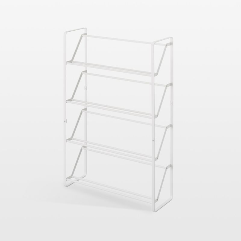 This four-tiered rack from Yamazaki maximizes shoe storage with a small footprint and fresh, minimalist design. Made of white-finished steel, the rack has slanted shelves that keep the profile ultra-slim. Clean-lined and functional, the rack works in the closet as well as on view in a mudroom or entryway.