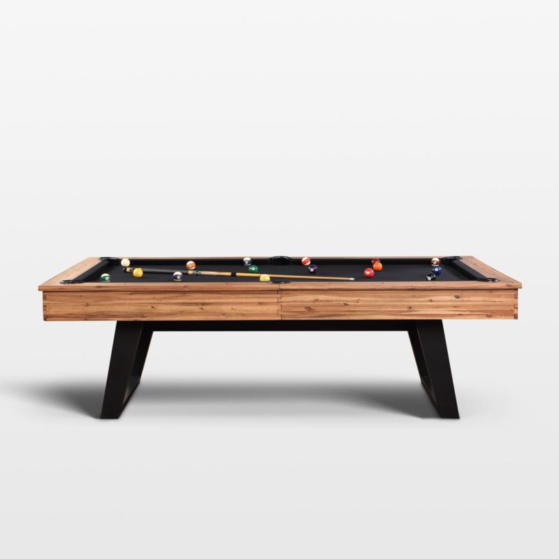 Elevate your game—and game room—with our exclusive Yukon pool table. Set on architecture-inspired, angled metal legs, the table is crafted of sustainably sourced acacia finished by hand with a multi-step process to bring out the beautiful grain. Box joints and plank construction add woodworking details to give the table its modern farmhouse appeal. Everything's included to get the game going, including leather drop pockets, a select ball set, four cues, triangle, 9-ball rack, bridge stick, metal bridgehead and under-rail and table brushes. The slate playing surface is covered in Teflon-coated black felt to protect the table from spills. The Yukon pool table is a Crate & Barrel exclusive.