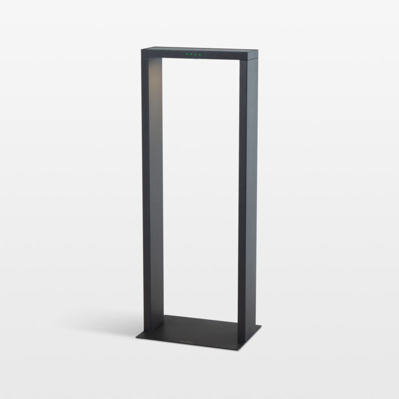 Sculptural, streamlined and ultra-modern, the Axis solar lamp brings soft, ambient light to your porch, patio or balcony. Made of aluminum with a sea salt-resistant black powdercoat finish, the clean-lined open rectangle is lit with an integrated LED bulb. The table lamp turns on and off in response to outdoor lighting conditions, providing up to 21 hours of illumination on a full solar charge. The perfect companion to contemporary outdoor furniture, the Axis elevates alfresco dinner parties and after-dark poolside lounging.