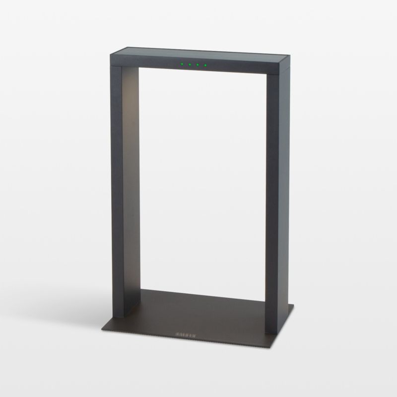 Sculptural, streamlined and ultra-modern, the Axis solar lamp brings soft, ambient light to your porch, patio or balcony. Made of aluminum with a sea salt-resistant black powdercoat finish, the clean-lined open rectangle is lit with an integrated LED bulb. The table lamp turns on and off in response to outdoor lighting conditions, providing up to 21 hours of illumination on a full solar charge. The perfect companion to contemporary outdoor furniture, the Axis elevates alfresco dinner parties and after-dark poolside lounging.