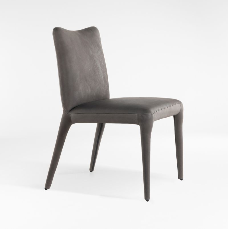 Our Zanni dining chair is all about the luxurious look and feel of top-grain leather. Fully upholstered from top to bottom in a gorgeous graphite grey, the chair is expertly tailored with a minimum of seams to render its gently scooped back, curved corners and tapered legs into a graceful silhouette.