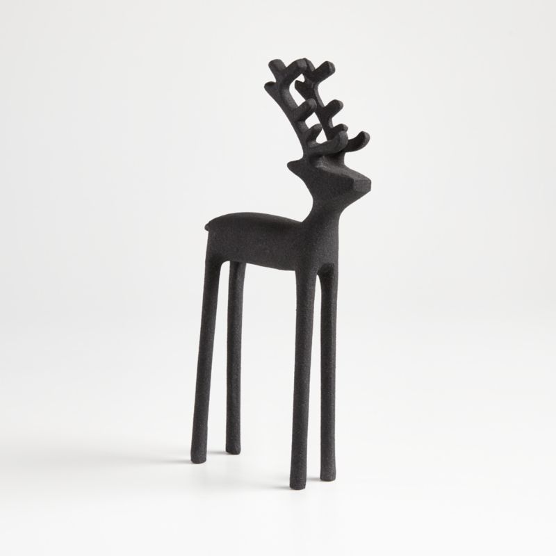 Crafted by hand with a modern, abstracted silhouette, flowing curves and a dark zinc finish, our reindeer sculpture gazes at the winter landscape, searching for lichen, moss and ferns to nibble. The caribou's elongated legs and rounded cuteness add a playful element to holiday decor. Group with our other exclusive reindeer sculptures to create a miniature herd on your fireplace mantel, buffet or dining room table—for an extra touch of wintry wonder, sprinkle the scene with fluffy faux snow. The zinc reindeer is a Crate & Barrel exclusive.