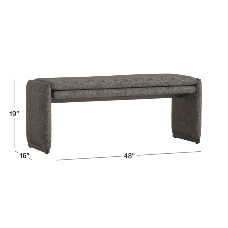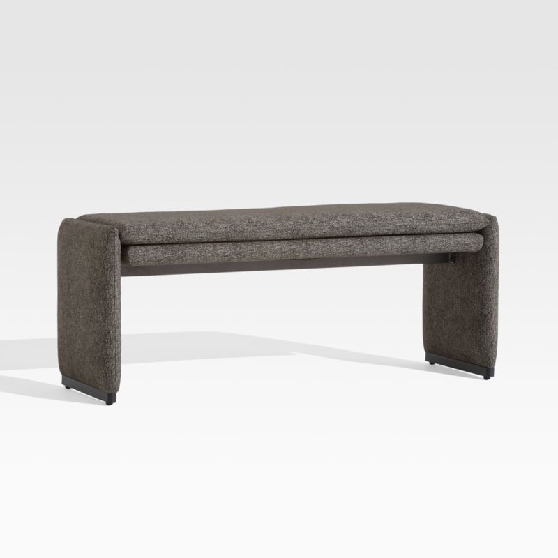 Fully upholstered Zuma brings living-room style outdoors. Knife-edge tailoring of the dark grey weather-resistant fabric gives the rectangles and squares that compose this modern bench crisp, form-defining edges. Slim yet supportive seat cushions let the bench sit relaxed and loungy. To protect the fabric from touching the ground, matte black metal sled feet add a bit of elevation. A new approach to outdoor entertaining, the Zuma collection is a Crate and Barrel exclusive.