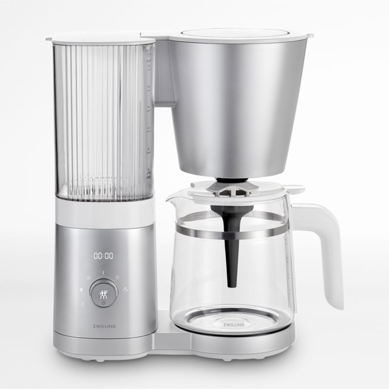 This sleek silver coffee maker brews 12 cups of coffee awarded the prestigious Golden Cup Standard by the Specialty Coffee Association. Inspired by the handcrafted pour-over process, the showerhead moistens grounds evenly to pre-brew—or bloom—the grounds to release carbon dioxide and develop richer flavors. Once brewing begins, the integrated drip circulator ensures consistent coffee in every cup. The warming plate keeps coffee at drinking temperature in the glass carafe.