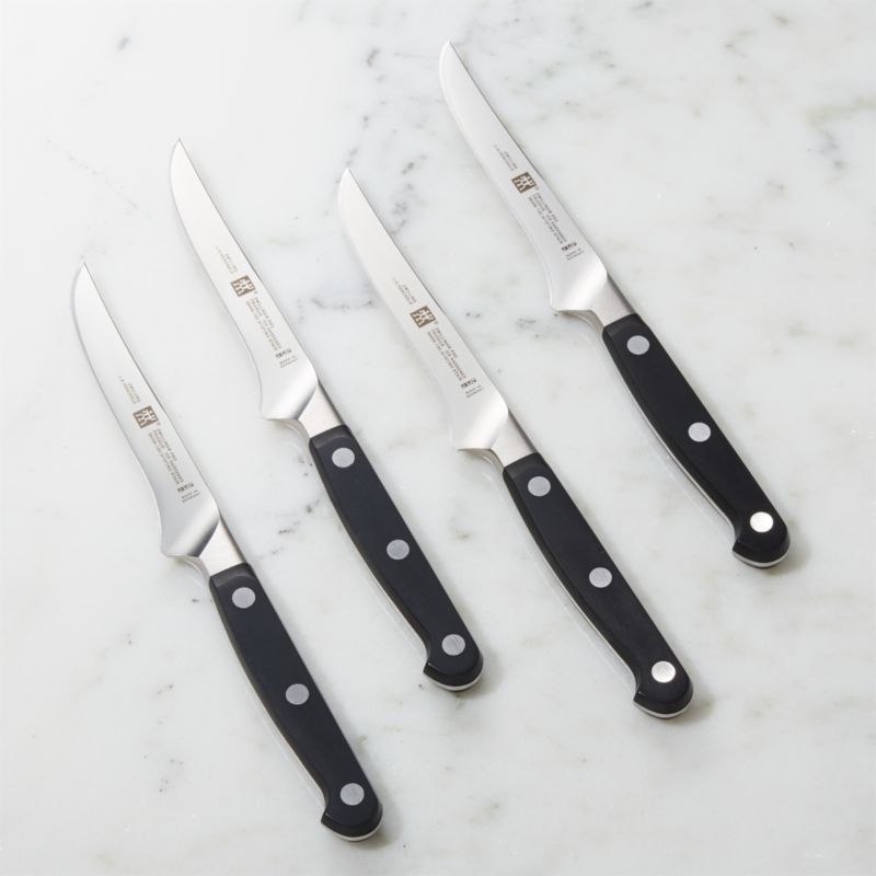 This set of steak knives feature an innovative curved bolster that acts as an extension of the hand, supporting a pinch grip for optimal cutting of steaks and chops. Forged from a single piece of steel, the ice-hardened blades are incredibly sharp, maintaining a long-lasting edge and will not stain or chip.