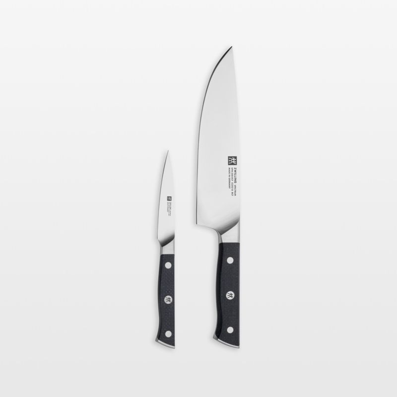 ZWILLING's Spectrum knives give home cooks professional-quality precision and sharpness. Forged of high-carbon stainless steel, Spectrum knives feature slim shapes, curved bolsters, razor-sharp blades and matte black lattice-patterened handles. The super-sharp blades are precision honed with a 25-degree edge for expert slicing and curved bolsters that enhance comfort and control. Inspired by the textured look of jute, the matte black handles are moisture-resistant and provide a non-slip, ergonomic grip. The paring and chef's knives in this two-piece set cover everything from detailed work to large chopping tasks.