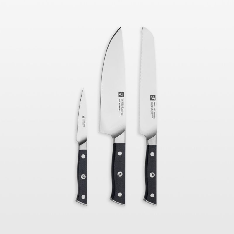 ZWILLING's Spectrum knives give home cooks professional-quality precision and sharpness. Forged of high-carbon stainless steel, Spectrum knives feature slim shapes, curved bolsters, razor-sharp blades and matte black lattice-patterened handles. The super-sharp blades are precision honed with a 25-degree edge for expert slicing and curved bolsters that enhance comfort and control. Inspired by the textured look of jute, the matte black handles are moisture-resistant and provide a non-slip, ergonomic grip. This three-piece starter set equips your kitchen with essential bread, paring and chef's knives for a range of chopping, dicing and slicing tasks.