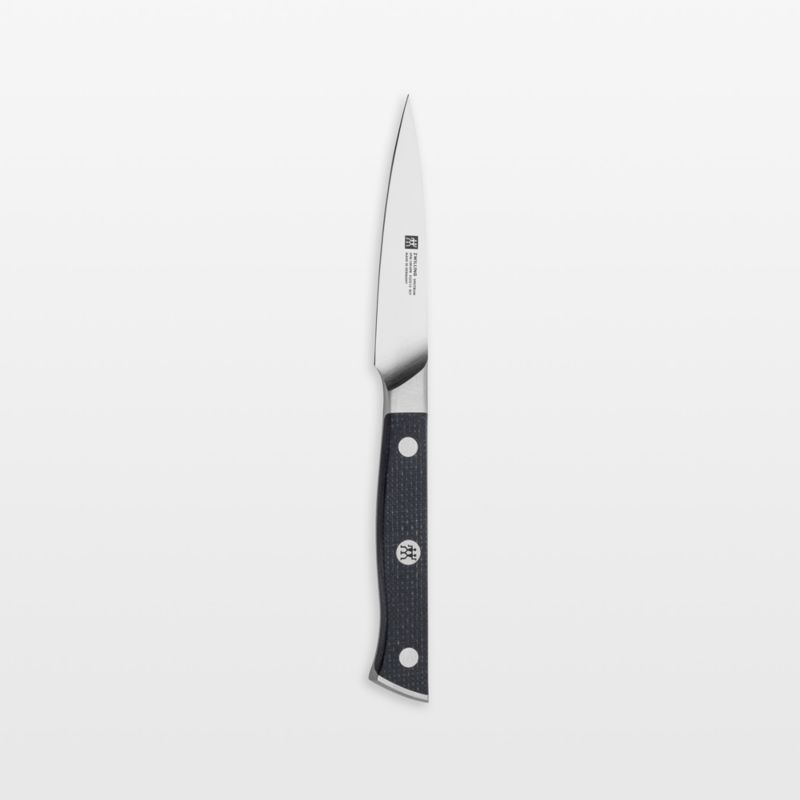 ZWILLING's Spectrum knives give home cooks professional-quality precision and sharpness. Forged of high-carbon stainless steel, Spectrum knives feature slim shapes, curved bolsters, razor-sharp blades and matte black lattice-patterened handles. The super-sharp blade is precision honed with a 25-degree edge for precise slicing, and a curved bolster enhances comfort and control. Inspired by the textured look of jute, the matte black handle is moisture-resistant and provides a non-slip, ergonomic grip. The paring knife is a kitchen essential, ideal for smaller tasks such as peeling vegetables and segmenting citrus.